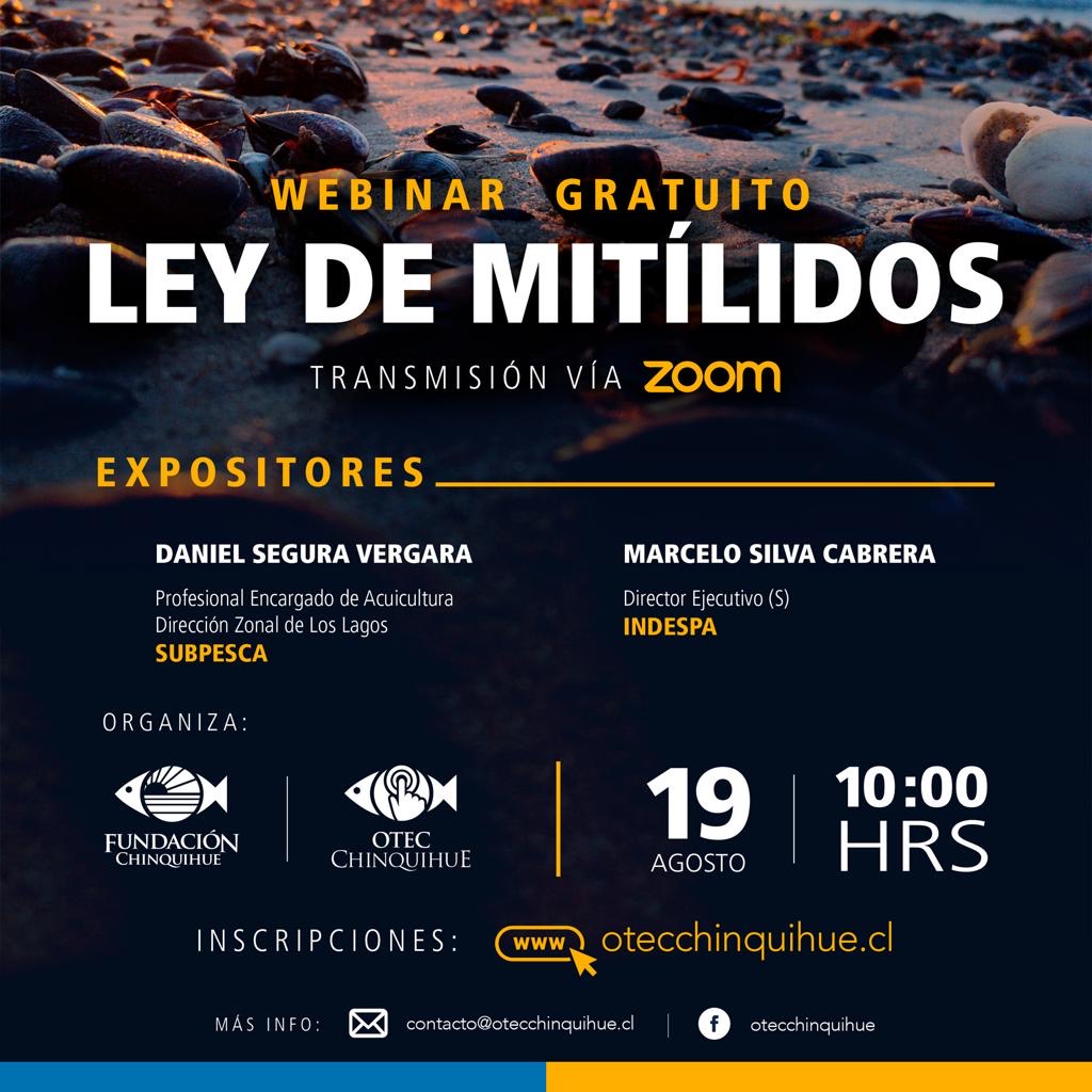 Para el próximo miércoles 19 de agosto, a partir de las 10 horas, está fijado un nuevo seminario en línea organizado por OTEC Chinquihue, filial de Fundación Chinquihue. En esta oportunidad el tema que se abordará tiene que ver con la recientemente promulgada “Ley mitílidos”, cuya emisión se realizará exclusivamente a través de la plataforma Zoom, previa inscripción de los interesados.